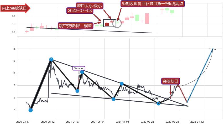 ➣ 突破缺口形成后,后续k已经超过14根,跳空突破降🚩楔型关键点后, 出现【完全回踩】迹象, 但后续走势回踩幅度持续降低,缺口压制继续,短期收盘价回补缺口第一根k线高点