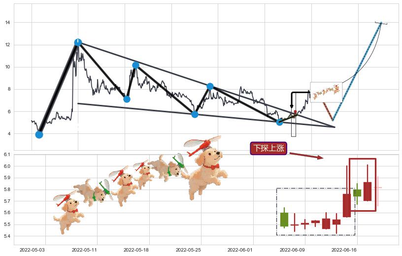 ➣ 低点影线(2022-04-29: 5.16 )→回踩→第二根k线低点(2022-04-28: 5.24 )