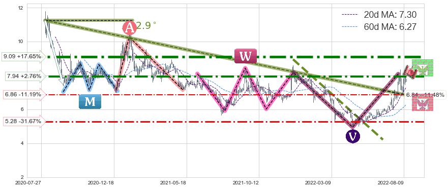 ➣ 2020-08-03-2022-06-28下跌趋势存在反转上涨[机会],其原下跌趋势的阻力位(6.84)已被突破[强支撑信号],原下跌趋势角度: 32.9˚
