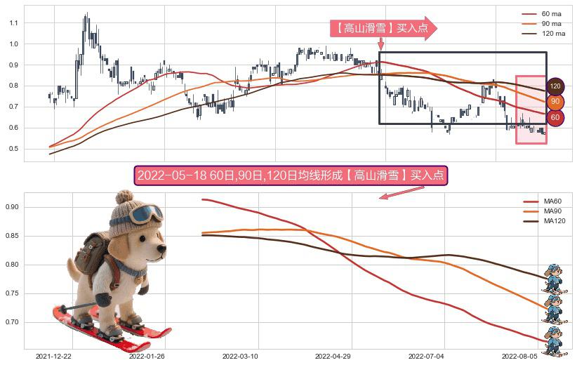 ⚀ 2022-02-17日-2022-08-11日显现 60日-90日-120日均线 【高山滑雪】买入点 看多信号,后市看涨,买入