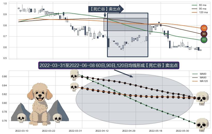 ⚀ 2022-04-01-日至2022-06-08-日显现 60日-90日-120日均线 【死亡谷】卖出点 看空信号,后市看跌,卖出