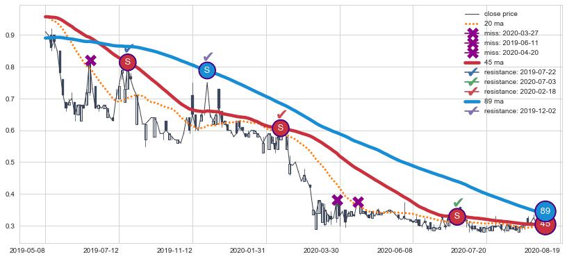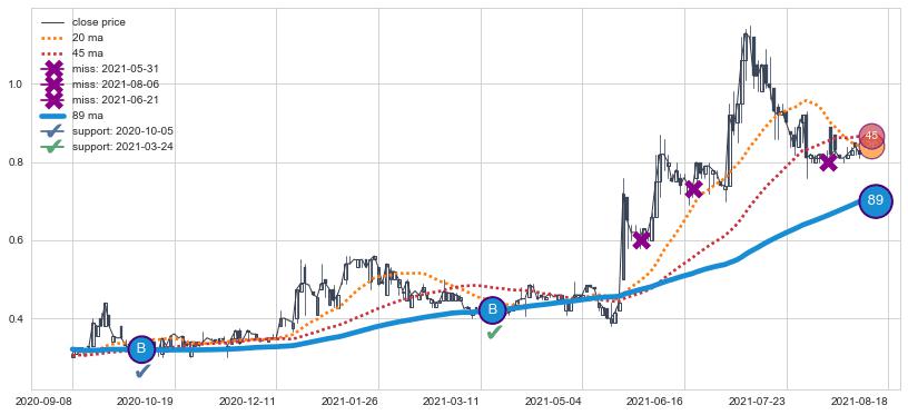 ⚁ MA3和MA8走势平行,且始终保持在短距离内,MA21始终在短中期均线上方,与短中期均线保持一定的距离,微微下行