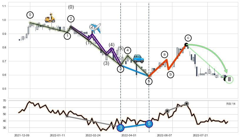 ➣ a,c调整浪MACD, RSI, KDJ走势都【未出现】背离,abc走势延续, 5浪反转概率增强