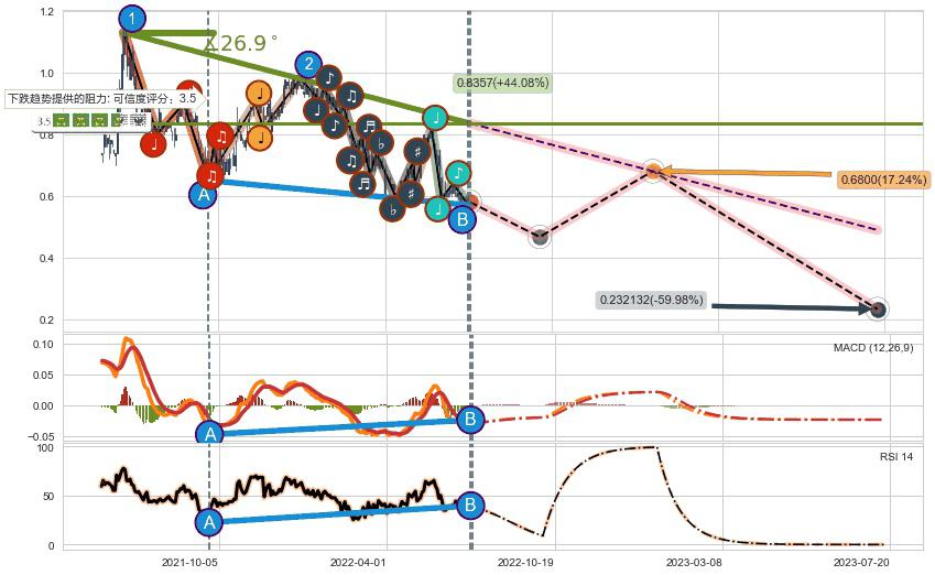 ♘ 在最后的下跌阶段2021-07-09至2022-08-11,存在 持续未破位的阻力位 ,阻力价格0.8357,可信任强度79.44%,其距离最后价格0.5800相差 +44.08%