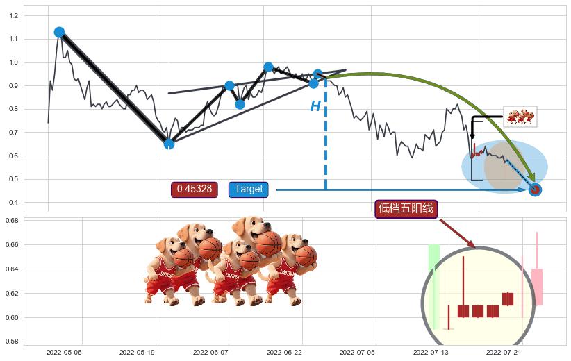 ➢ 收盘价(2022-05-23: 0.7100 )→再次回踩→第一根k线低点(2022-05-10: 0.6300 )
