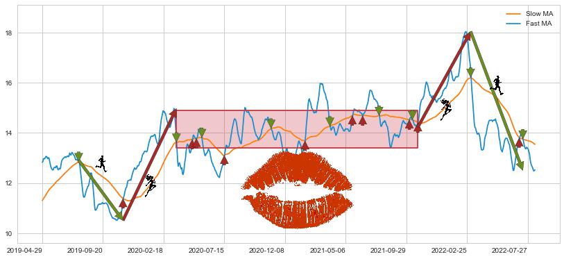 2022-03-07至2022-07-15 慢线与快线呈空头排列, 慢线与快线接触少,无缠绕
