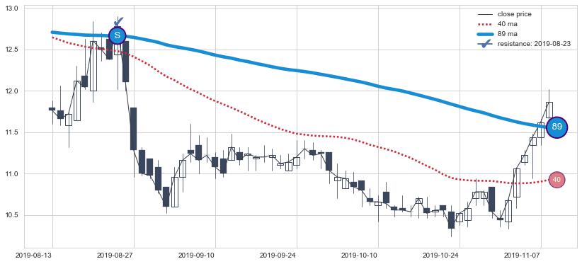⚅ 卖点向下突破均线后,价格走势有持续向下的迹象,但动能稍显不足,迟迟不能远离均线