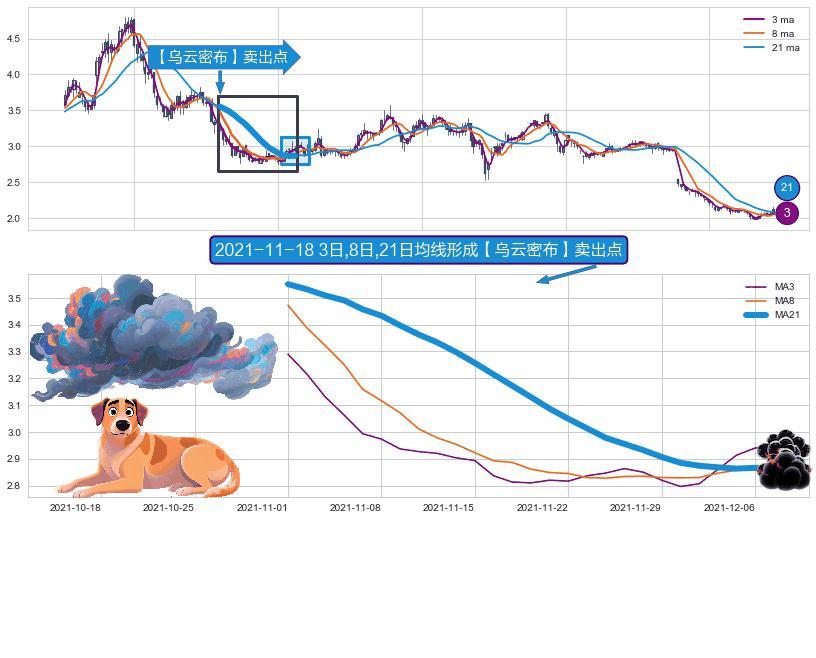 ⚀ 2021-11-01日-2021-12-07日显现 3日-8日-21日均线 【乌云密布】卖出点 看空信号,后市看跌,卖出