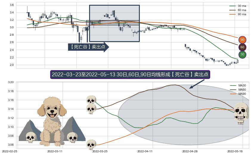 ⚀ 2022-03-24-日至2022-05-13-日显现 30日-60日-90日均线 【死亡谷】卖出点 看空信号,后市看跌,卖出