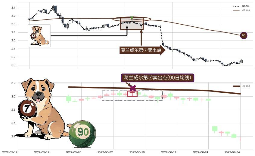 ⚀ 2022-06-08-日显现 葛兰威尔均线 90日均线 第⑦卖出点 下降趋势的中继信号,后市看跌,卖出信号