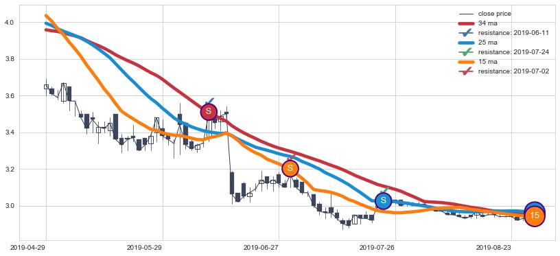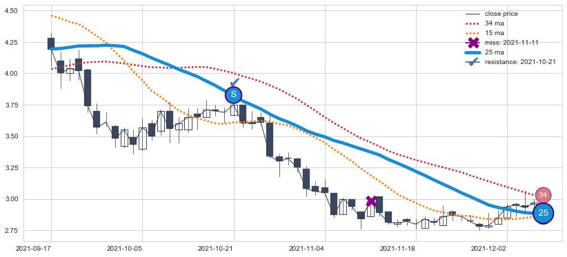 ⚁ MA3和MA8走势平行,且始终保持在短距离内,MA21始终在短中期均线上方,与短中期均线保持一定的距离,微微下行