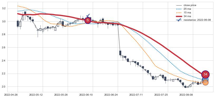 ⚂ 2022-04-08-日均线向上突破,2022-04-20-日重新下穿均线破位,均线阻力再次生效
