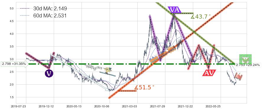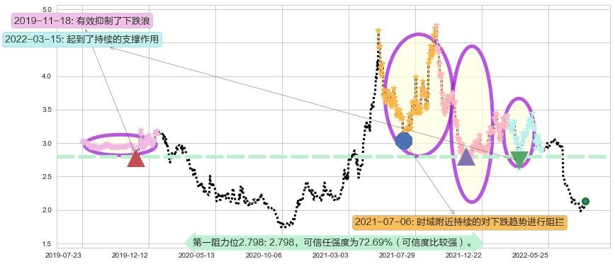 ♘ 阻力价格位2.798,可信任强度72.69%,距离最后交易2022-08-12形成的收盘价格2.130相差 +31.35%