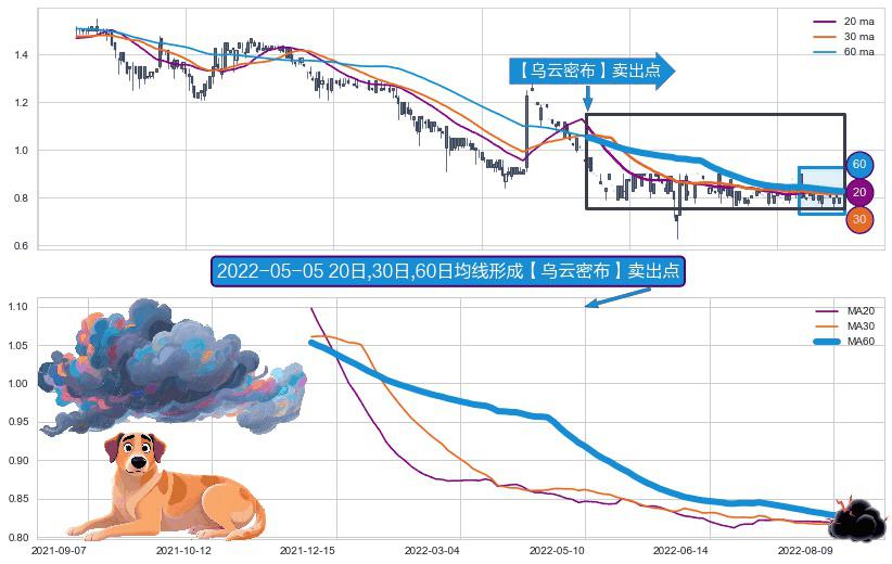 ⚀ 2021-12-01日-2022-08-11日显现 20日-30日-60日均线 【乌云密布】卖出点 看空信号,后市看跌,卖出