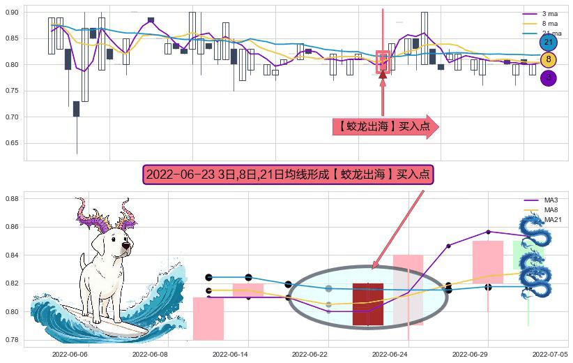 ⚀ 2022-06-23日显现 3日-8日-21日均线 【蛟龙出海】买入点 看多信号,后市看涨,买入