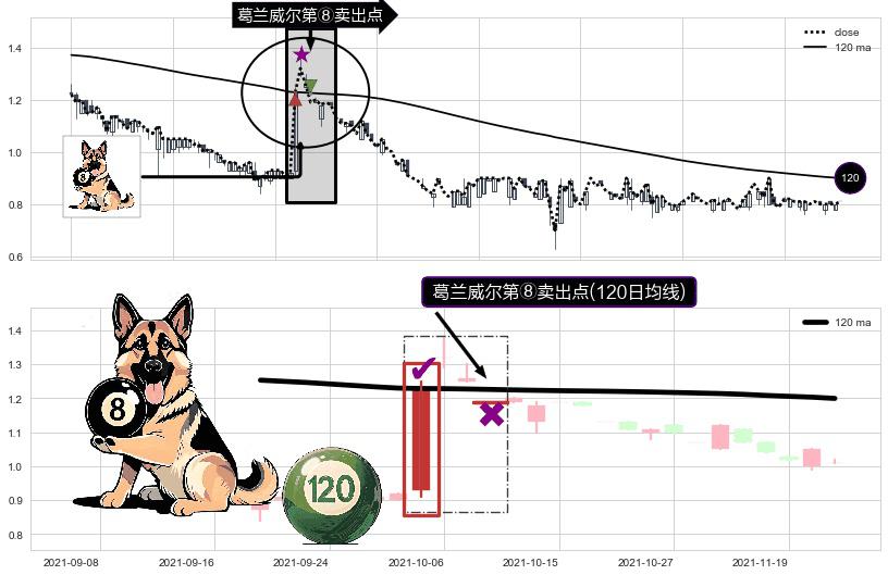 ⚀ 2021-10-08-日显现 葛兰威尔均线 120日均线 第⑧卖出点 下降趋势的中继信号,后市看跌,卖出信号
