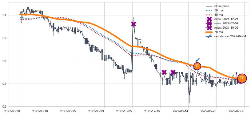 ⚄ 均线向上突破后价格上探力度低,正乖离率低,再次向下破位后维持原均线下跌趋势【强】