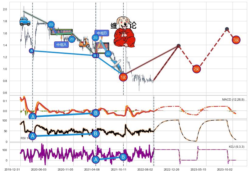 ➣ 【中枢B】:2021-03-11-2021-05-25,中枢由5笔构成,共46交易日, ZG=1.4300, ZD=1.3400