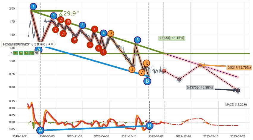 ♘ 在最后的下跌阶段2020-01-20至2022-03-31,存在 持续未破位的阻力位 ,阻力价格1.1433,可信任强度84.19%,其距离最后价格0.8100相差 +41.15%