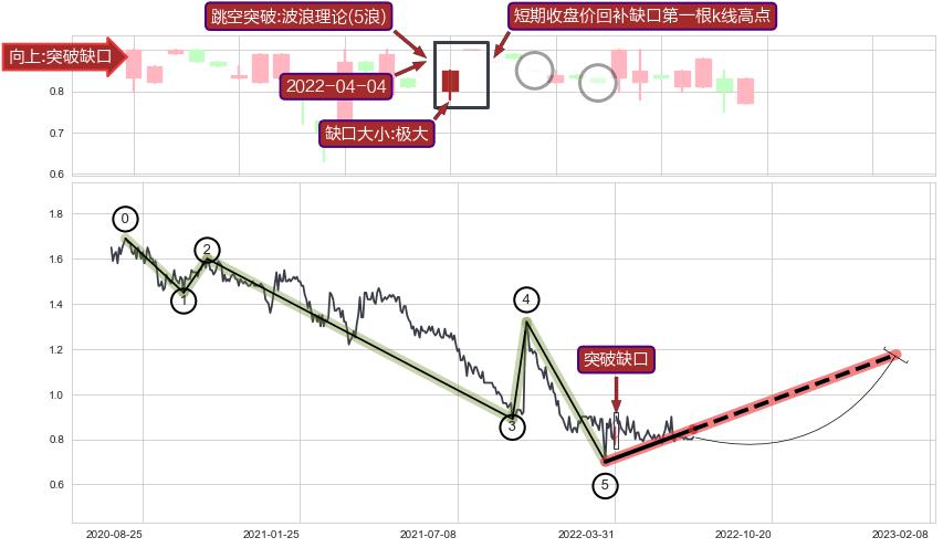 ➢ 突破缺口形成后,后续k已经超过14根,跳空突破波浪理论(5浪)关键点后, 出现【完全回踩】迹象,短期收盘价回补缺口第一根k线高点