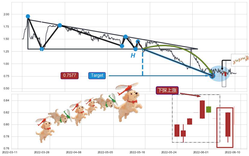 ➣ 收盘价(2022-04-22: 0.8500 )→回踩→第二根k线低点(2022-04-04: 0.9000 )