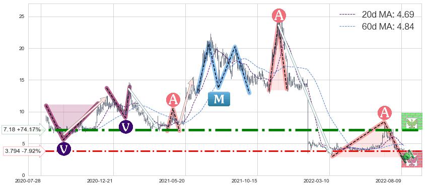 ♘ 阻力价格位7.18,可信任强度89.01%,距离最后交易2022-08-12形成的收盘价格4.12相差 +74.17%