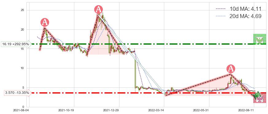 ♘ 阻力价格位16.19,可信任强度74.25%,距离最后交易2022-08-12形成的收盘价格4.12相差 +292.95%