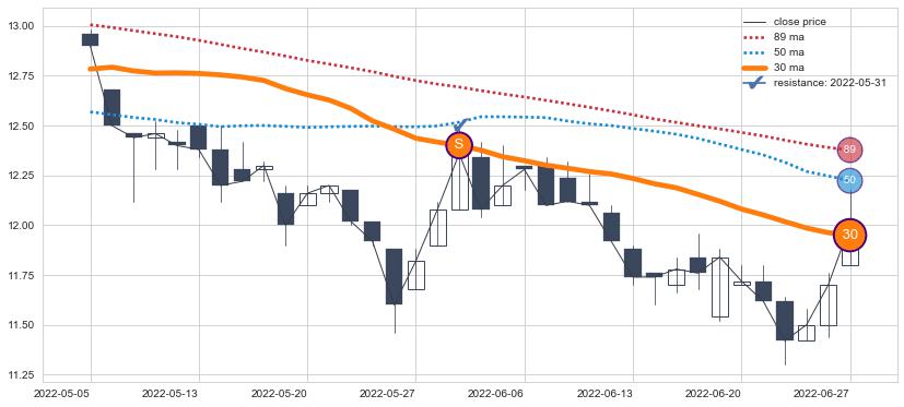下跌趋势2022-05-05-2022-06-27,均线30确认关键阻力1处