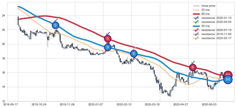 下跌趋势2019-09-17-2020-06-11,均线89, 50确认关键阻力4处