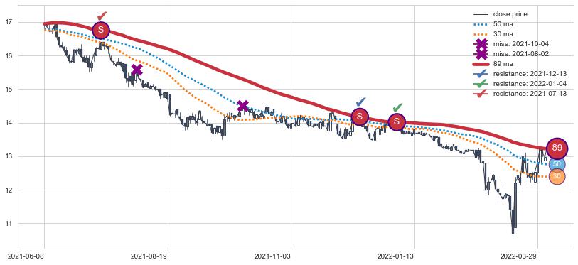 下跌趋势2021-06-08-2022-04-04,均线89确认关键阻力3处