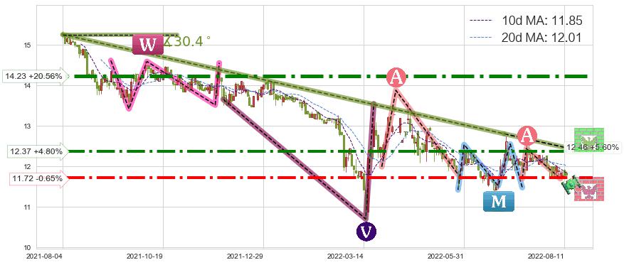 ♘ 支撑价格位11.72,可信任强度77.52%,距离最后交易2022-08-12形成的收盘价格11.80相差 -0.65%