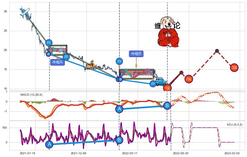 ➣ 【中枢B】:2022-03-14-2022-06-23,中枢由5笔构成,共67交易日, ZG=14.86, ZD=13.48
