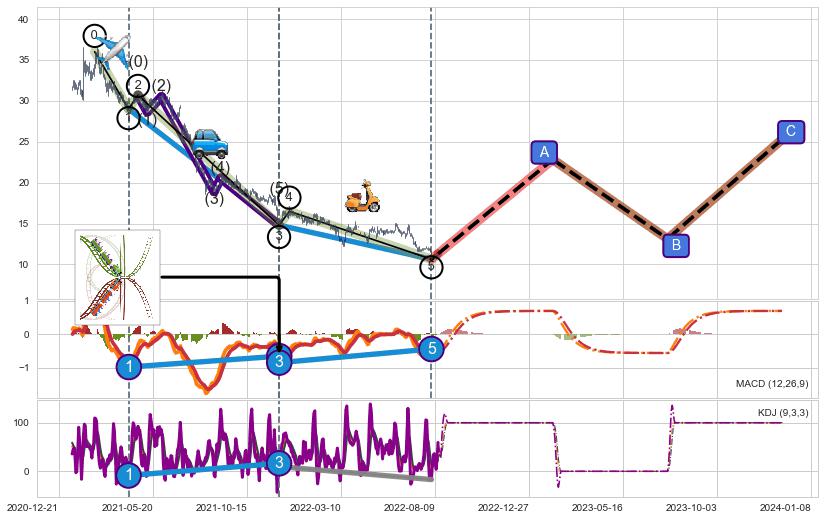 ➣ 第一, 三, 五浪下跌动能逐渐【衰弱变小】,趋势呈现不稳迹象