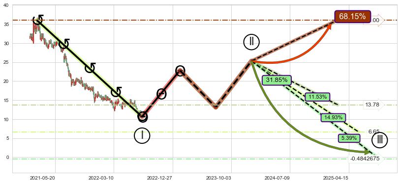 ➢ 循环浪继续向下【最高】位置(2025-02-21, 13.78),匹配聚类样本比例36.21%, 可能性概率11.53%