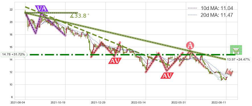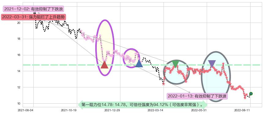 ♘ 阻力价格位14.78,可信任强度94.12%,距离最后交易2022-08-12形成的收盘价格11.22相差 +31.72%