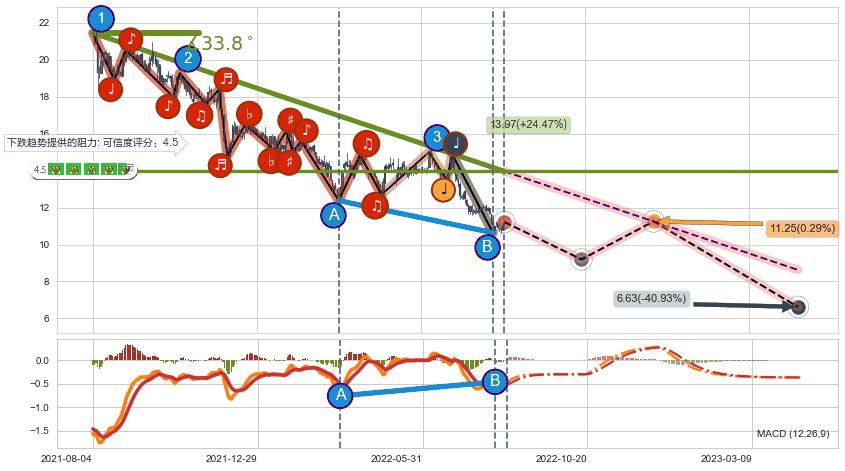 ♘ 在最后的下跌阶段2021-08-04至2022-08-11,存在 持续未破位的阻力位 ,阻力价格13.97,可信任强度88.66%,其距离最后价格11.22相差 +24.47%