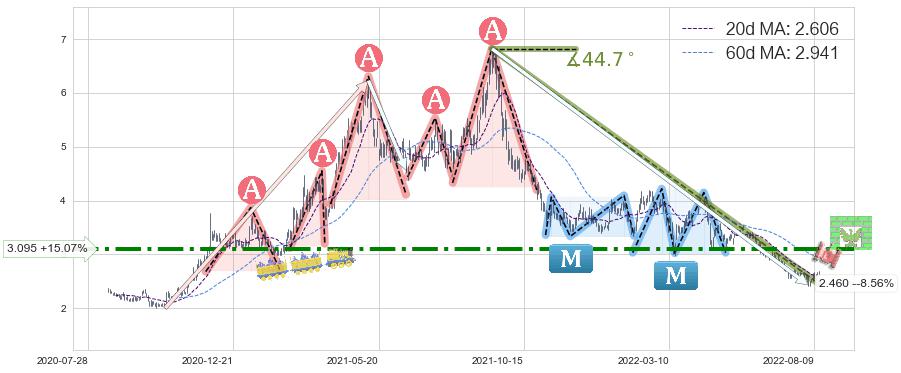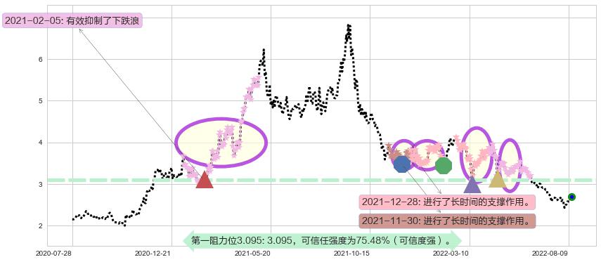 ♘ 阻力价格位3.095,可信任强度75.48%,距离最后交易2022-08-12形成的收盘价格2.690相差 +15.07%