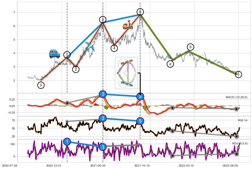 ➢ a,c调整浪MACD, RSI, KDJ走势都【未出现】背离,abc走势延续, 5浪反转概率增强