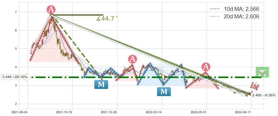 🦴 长线均值回复组合短线趋势跟踪[强阻力信号]2021-09-09-2022-08-11下跌趋势依然成立(下跌趋势跟踪依然存在),短线价格略微上行反弹(均值回复猜想),即将接近下跌趋势提供的未破位阻力价格:2.460。