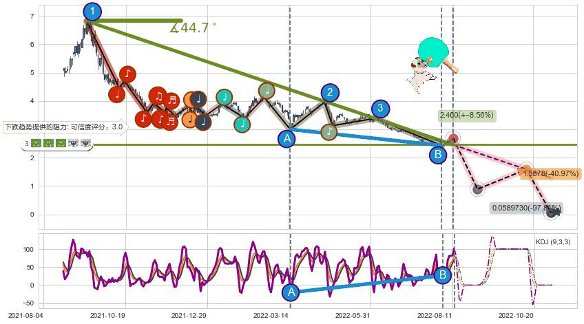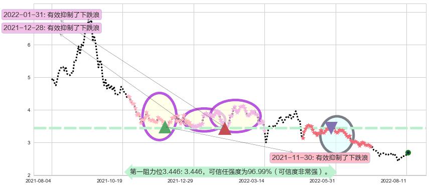 ♘ 阻力价格位3.446,可信任强度96.99%,距离最后交易2022-08-12形成的收盘价格2.690相差 +28.10%