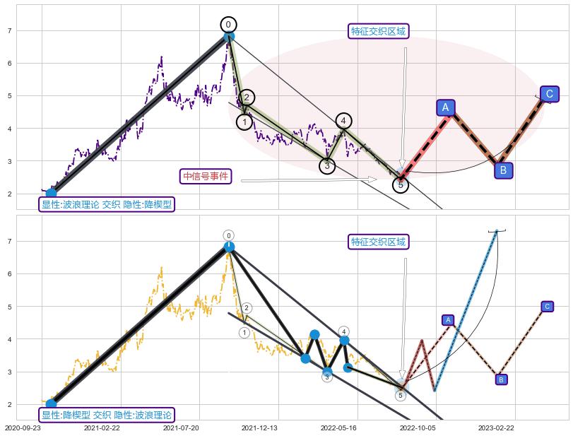 | 4 🅚:底部尽头线(上山虎) ➕ 🌊:波浪理论猜想下跌浪5已形成,猜想后续形成abc反弹上涨(均值回复) ☞ 看多信号 ⇥ 【🅚线】交织【图形】⇥ 综合量化分数: 51 | > |