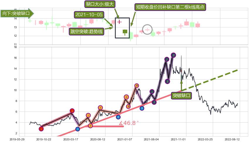 ➢ 2019-07-25-2021-10-05上升趋势存在反转[风险],其原上升趋势的支撑位(13.73)已破位[强阻力信号],原上升趋势角度: 46.8˚