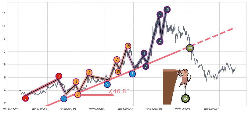 ✂️ 2019-07-25-2021-10-05上升趋势存在反转[风险],其原上升趋势的支撑位(13.73)已破位[强阻力信号],原上升趋势角度: 46.8˚