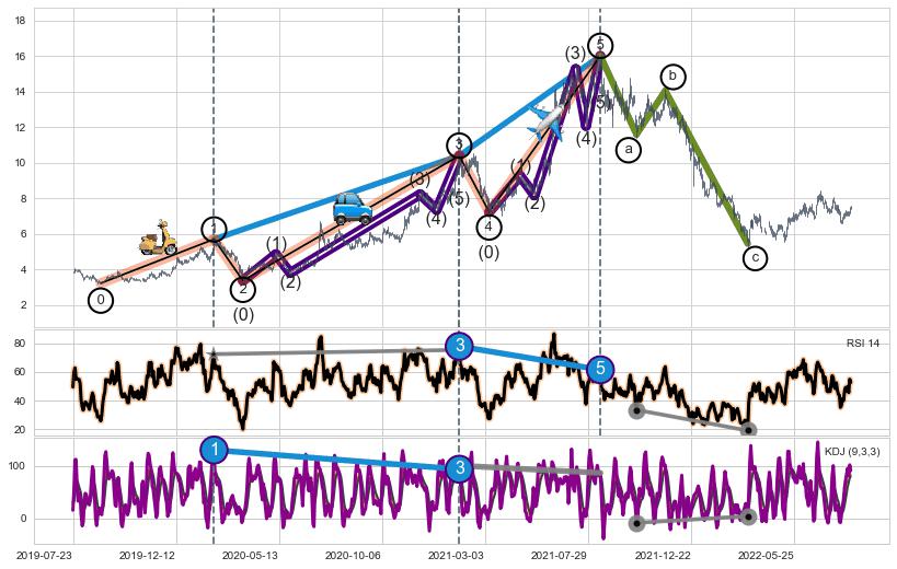 ➣ a,c调整浪MACD, RSI, KDJ走势都【未出现】背离,abc走势延续, 5浪反转概率增强