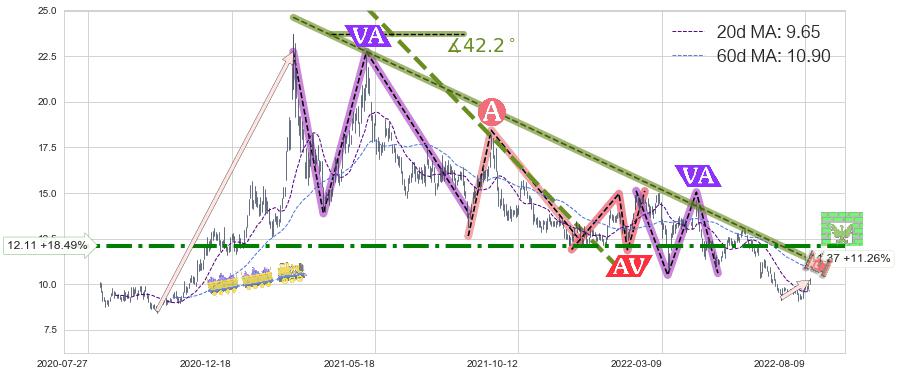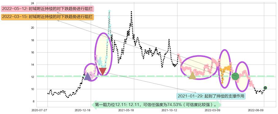 ♘ 阻力价格位12.11,可信任强度74.53%,距离最后交易2022-08-12形成的收盘价格10.22相差 +18.49%