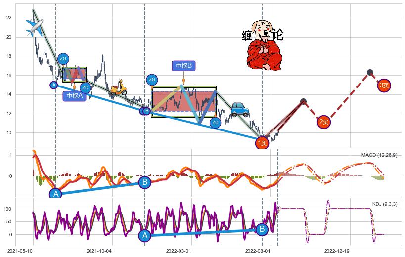 ➣ 【中枢B】:2021-12-15-2022-04-19,中枢由4笔构成,共81交易日, ZG=14.28, ZD=12.26