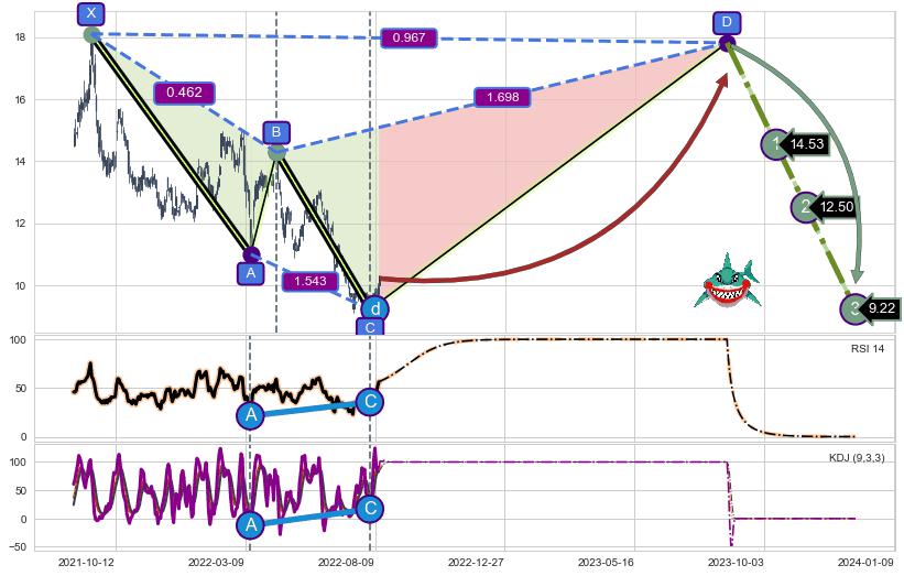 ➣ 未完成【鲨鱼】形态起点X: 2021-09-13, 已到达C点: 2022-08-03, 预测最终D点: 2023-08-23, 共491交易日