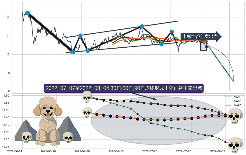 | 4 🅚:【断头铡刀】卖出点 ➕ 📐:升旗形下行突破支撑位破位, 猜想持续下沉下跌,被突破的支撑位已变为阻力位 ☞ 看空信号 ⇥ 【均线】交织【图形】⇥ 综合量化分数: 30 | > |