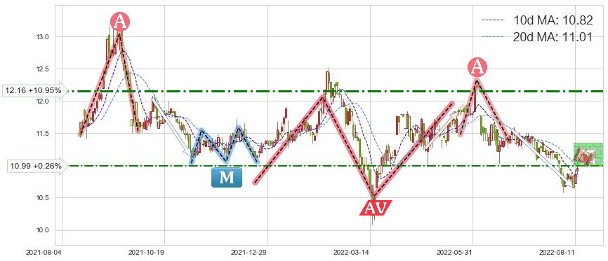 ♘ 阻力价格位10.99,可信任强度48.29%,距离最后交易2022-08-12形成的收盘价格10.96相差 +0.26%