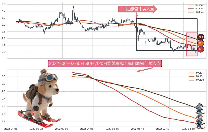 形态多维评估: ⚀ 2022-03-11日-2022-08-12日显现 60日-90日-120日均线 【高山滑雪】买入点 看多信号,后市看涨,买入